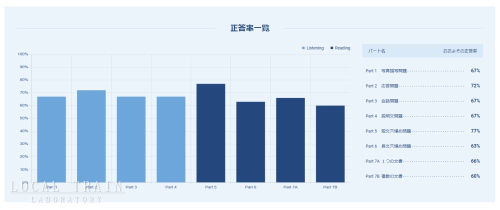 各パートでの正答率も7割前後と、中途半端な英語力では太刀打ちできないことがわかりました。