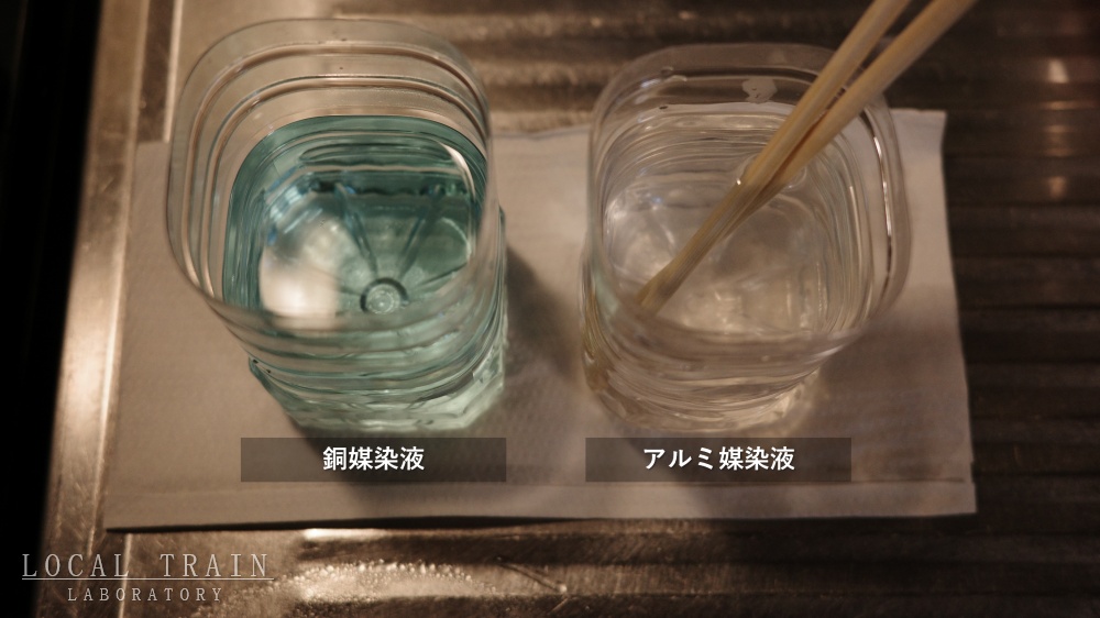 銅媒染液は、水で10倍程度に薄めています。アルミ媒染液は焼きミョウバンを3gに水を250mL。