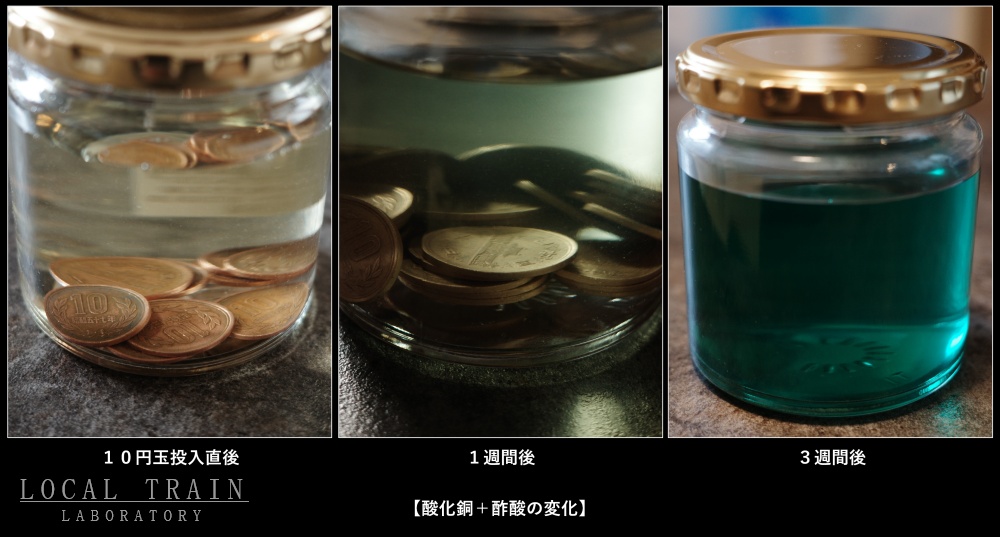 以下の写真は、酢酸に10円玉を入れてから3週間までの推移。