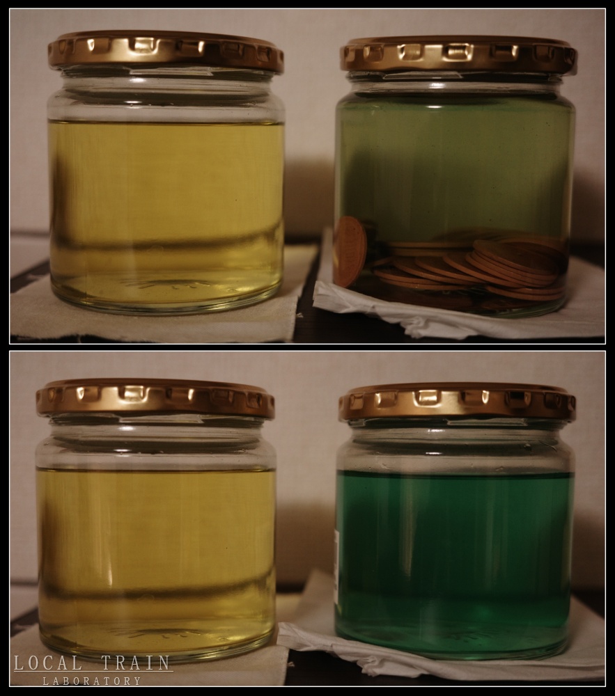 その後、10円玉を入れ替えたりして酸化銅を補充していくと、スタートから3週間後には青緑の液体になりました。