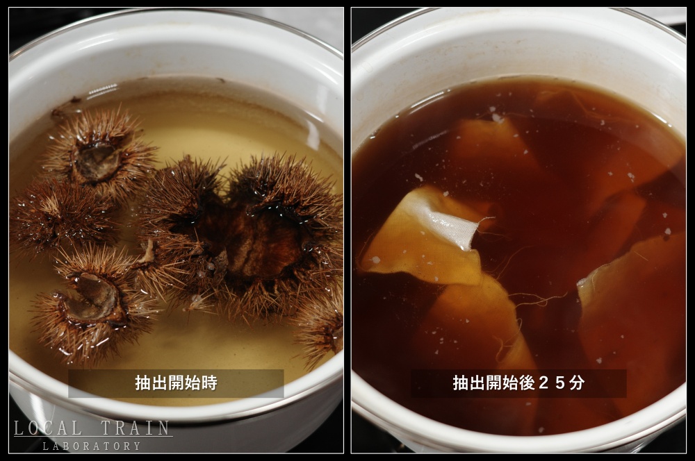 まずは、栗のいがから色を抽出します。約25分、煮出しました。