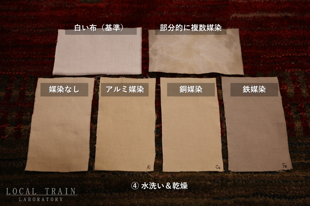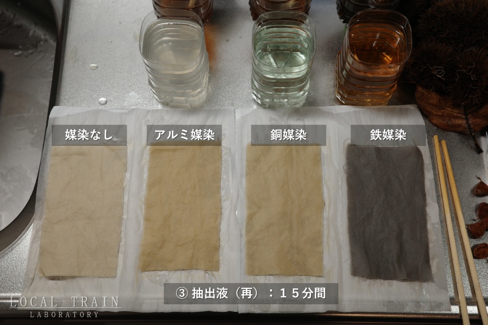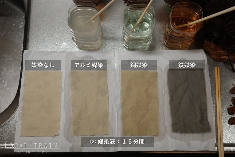 アルミ・銅・鉄の媒染液に15分間浸します。媒染の効果を見るために、媒染しない布も用意します。(写真左)