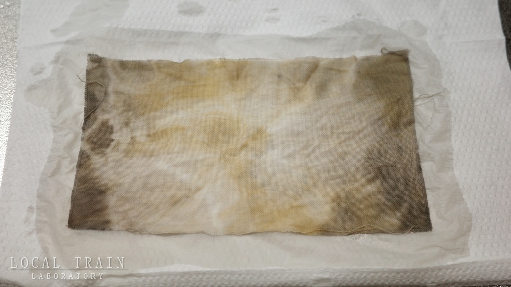 水洗い&乾燥の写真で「部分的に複数媒染」として示した布は、媒染によって色に差が出ることを使って模様を作ってみた例です。