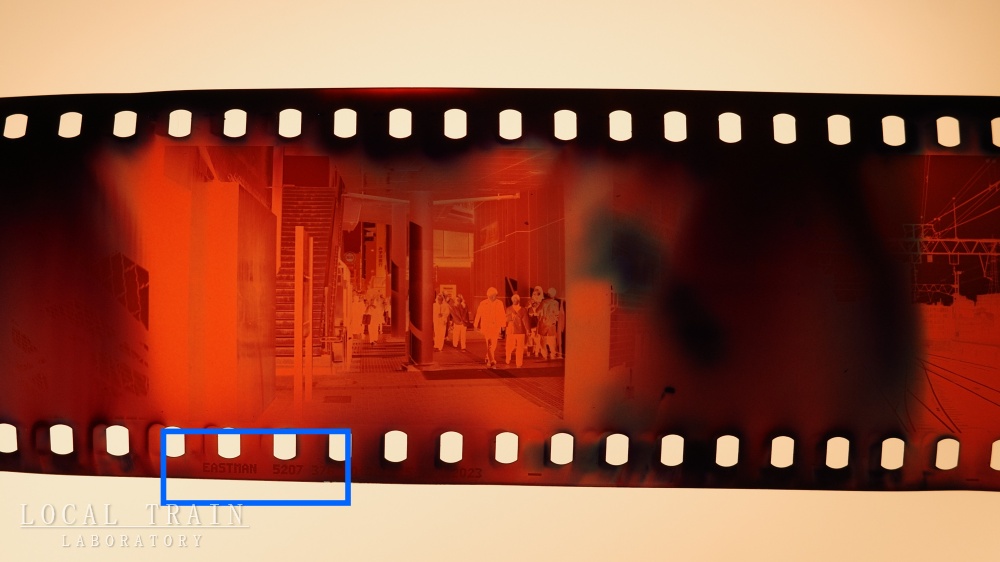 さて、現像後のネガ(青枠部分)を見てみると「EASTMAN 5207」とあり、シネマフィルムの「VISION 3 250D」だということが分かります。