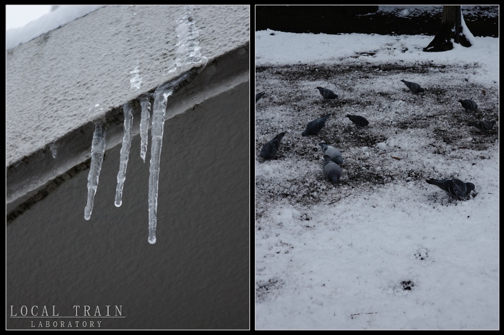 左の写真は散歩中に見かけた一番大きな氷柱。右は雪の隙間から餌を探す鳩。