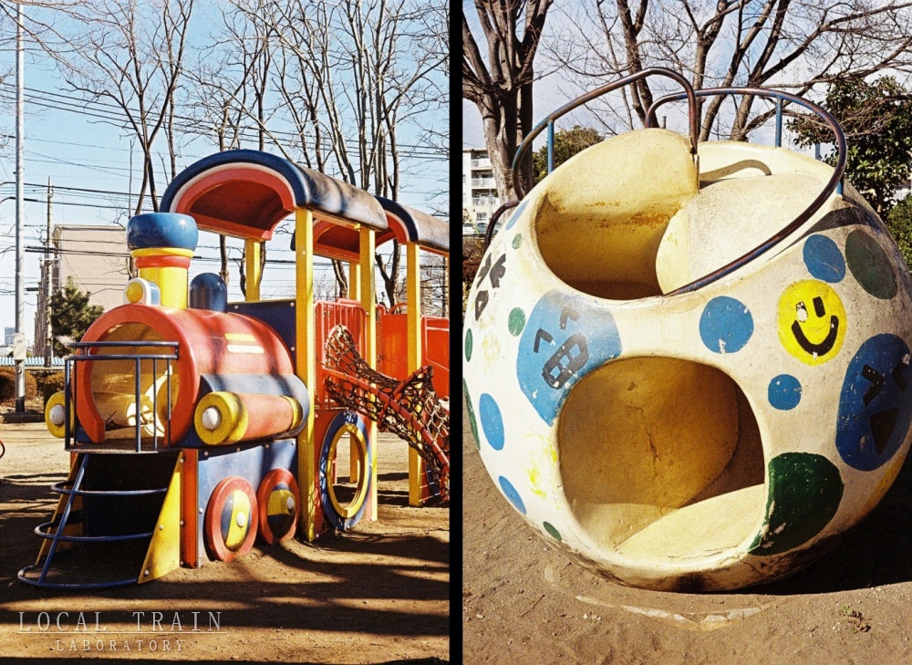 公園のカラフルな汽車とコンクリの塊。