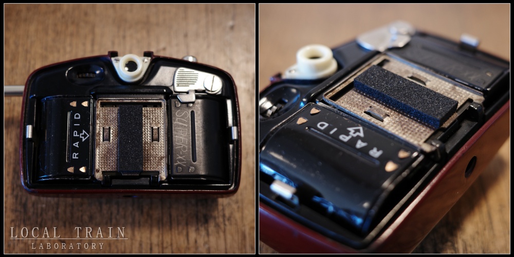 裏蓋を開けると「ラピッドシステム」であることが分かります。現行のフィルムは直接装填できませんが、専用の「ラピッドカートリッジ」があれば問題なく使えます。